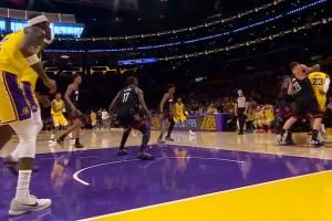 太软了!詹姆斯精妙背传找到艾顿 后者面对伊森只是造到了犯规