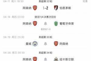 阿森纳下周赛程:周四欧冠1/4决赛次回合战葡体,周日客战曼城!